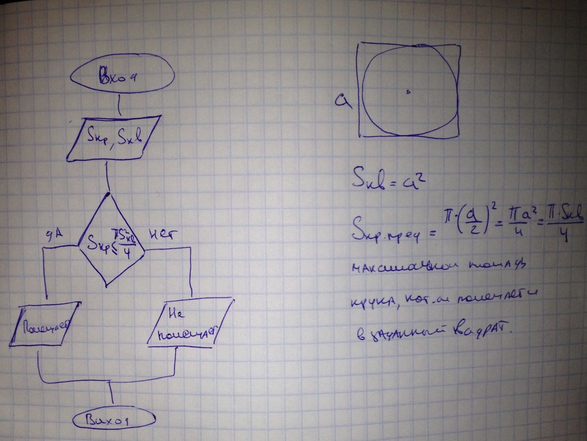 Составьте программу с блок схемой: 4. Заданы площади круга и квадрата. Поместится ли круг в квадрате?