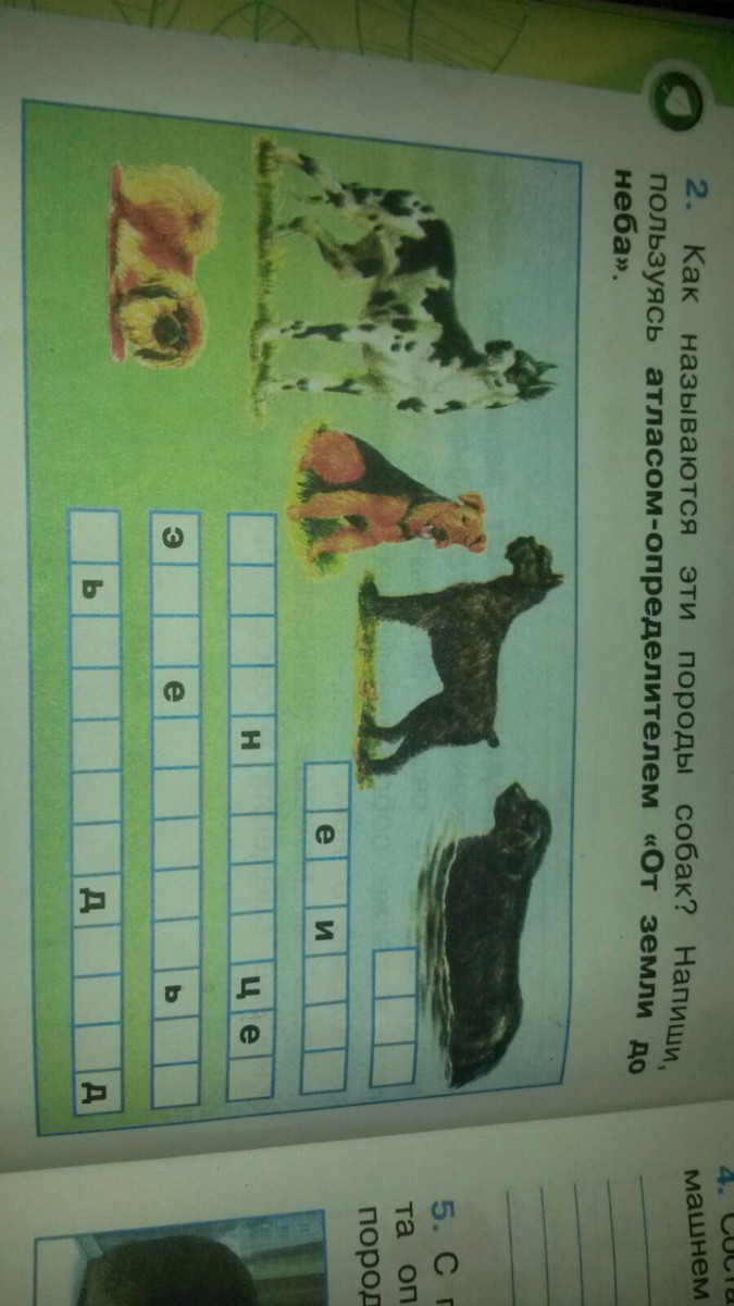 1. Дог ( пятнистый). 2. Пекинес ( под догом). 3. Резиншнауцер. ( сидит) . 4. Эрдельтерьер. 5. Ньюфаундленд ( в воде).