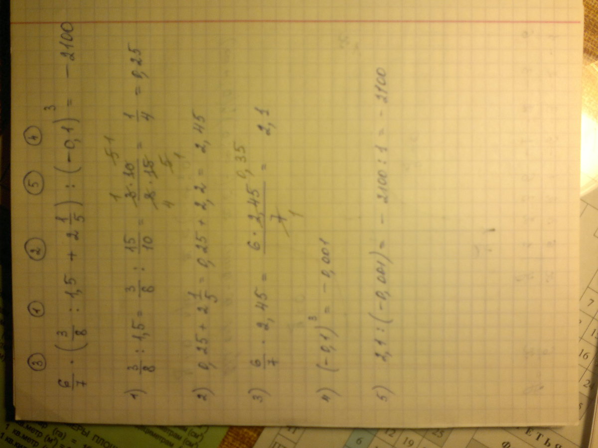 6/7 * (3/8 : 1,5 + 2 1/5) : (-0,1)^3 = - 2100,