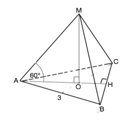 Все углы правильного треугольника равны 60°⇒ АН=АВ•sin60°=3√3)/2 ⇒ AO=АН•2/3=3/√3=√3. Из прямоугольного ∆ АМО высота МО=AO•tg60°=√3•√3=3 см Для правильного треугольника S=a²√3/4 S(ABC)=9√3/4 см² V(МАВС)= 9√3:4)•3:3=9√3:4 см³