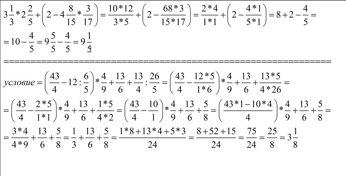 (10 3/4 - 12 / 1 1/5) * 4/9 + 2 1/6 + 3 1/4 / 5 1/5 =1/3+2 1/6+5/8=75/24=25/8=3 1/8