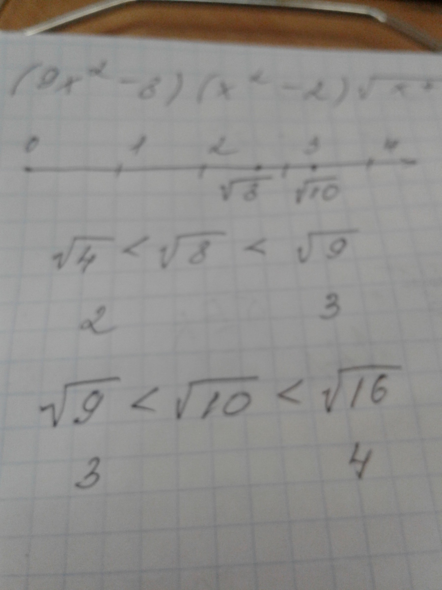так вот корень из 8 = это чуть чуть не доходя до 3( на пол клеточки), а корень из 10 - это на пол-клетки после отметки 3, так как сама точка 3 - это корень из 9