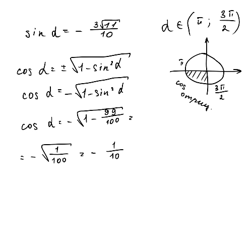 помогите пожалуйста решить!!!! найдите cos a если sin a= -3корень11 /10 и а принадлежит (pi: 3pi / 2