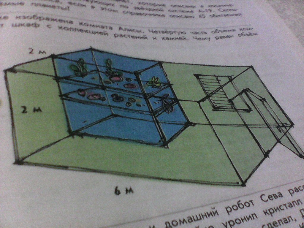 на рисунке изображена комната Алисы. Четвёртую часть объёма комнаты занимает шкаф с коллекцией растений и камней .Чему равен объём этого шкафа?