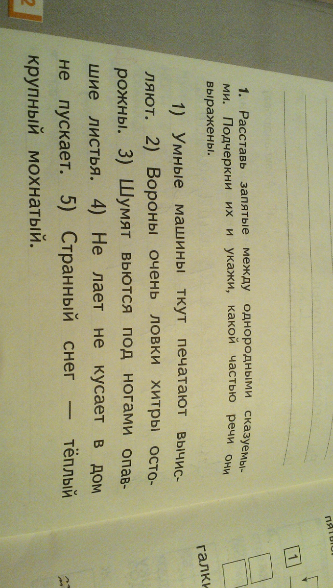Умные машины ткут, печатают, вычисляют. Вороны очень ловки, хитры, осторожны. Шумят, вьются, под ногами опавшие листья. Не лает, не кусает в дом не пускает. Странный снег-теплый, крупный, мохнатый.