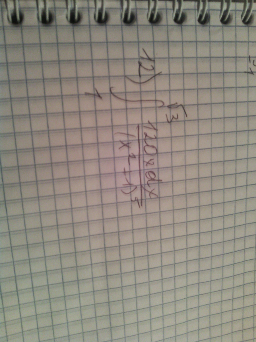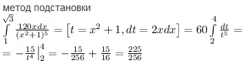 ![intlimits_1^{sqrt{3}} frac{120xdx}{(x^2+1)^5}=left[t=x^2+1, dt=2xdxright]=60intlimits_2^4 frac{dt}{t^5}= intlimits_1^{sqrt{3}} frac{120xdx}{(x^2+1)^5}=left[t=x^2+1, dt=2xdxright]=60intlimits_2^4 frac{dt}{t^5}=](https://tex.z-dn.net/?f=intlimits_1%5E%7Bsqrt%7B3%7D%7D++frac%7B120xdx%7D%7B%28x%5E2%2B1%29%5E5%7D%3Dleft%5Bt%3Dx%5E2%2B1%2C+dt%3D2xdxright%5D%3D60intlimits_2%5E4++frac%7Bdt%7D%7Bt%5E5%7D%3D)