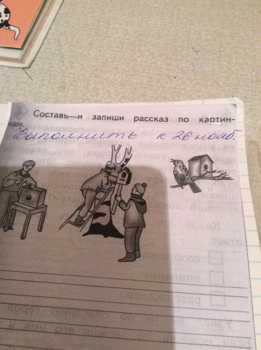 Сегодня мы с другом решили помочь птичкам-построить скворечник.Я сделал скворечник из дерева.А мой друг помог мне его повесить.В скворечник мы насыпали семечек и зерна.Птичкам он очень понравился.Они часто прилетали на это место.