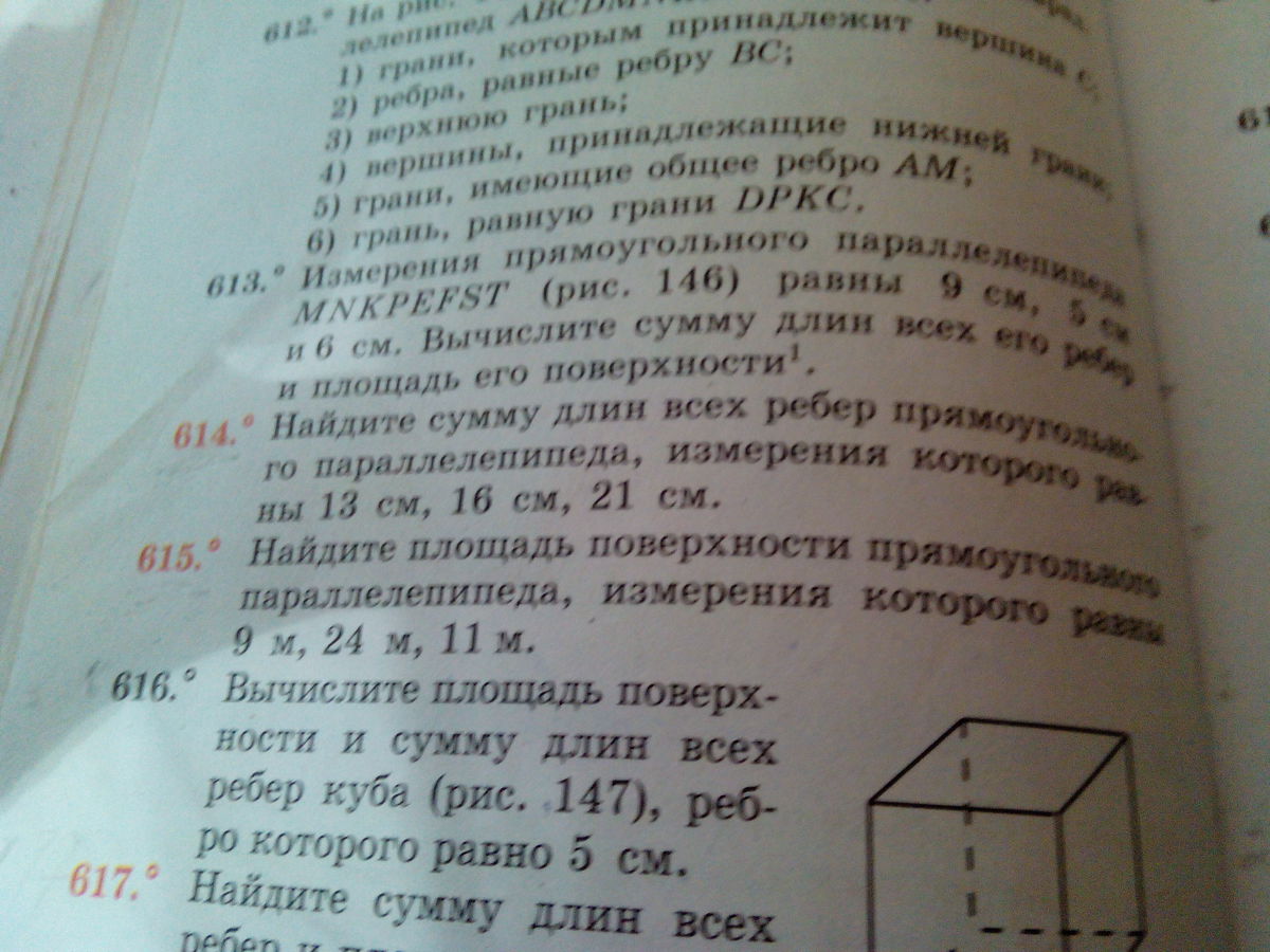 614. Измерения сторон прямоугольного параллепипеда - 13, 16 и 21 см. А так как в прямоугольном параллепипеде ребер 4 раза встречаются одинаковые ребра, следовательно: