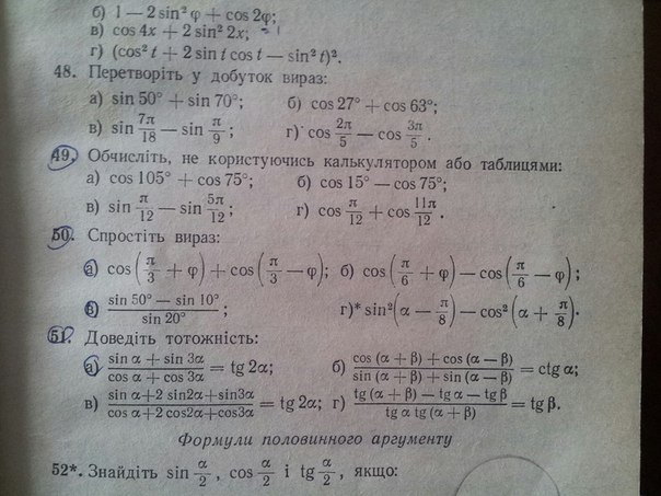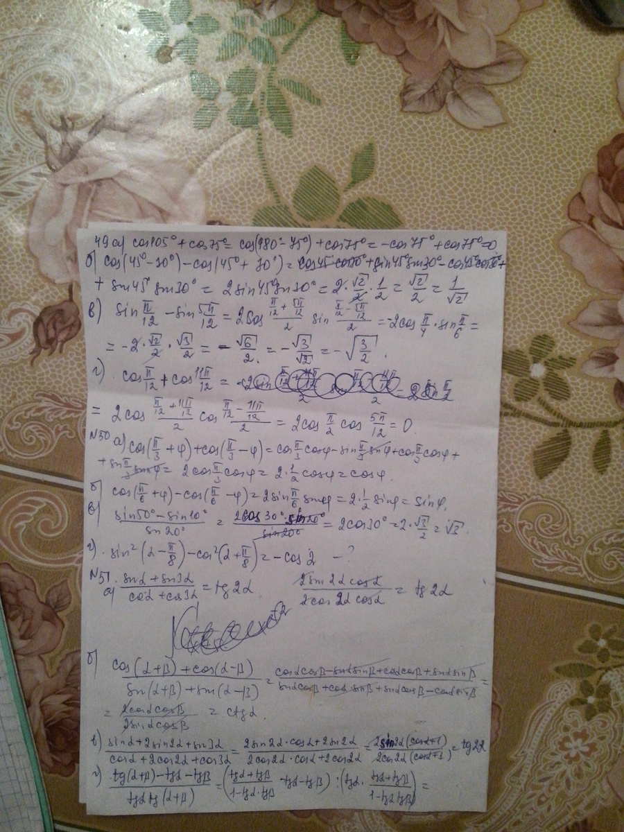 49.а)косинус в скобках 180 минус 75 плюс косинус 75 равно минус кос.75 плюс кос.75 равно 0, б) кос.45 минус 30 минус кос.30 плюс 45 равно