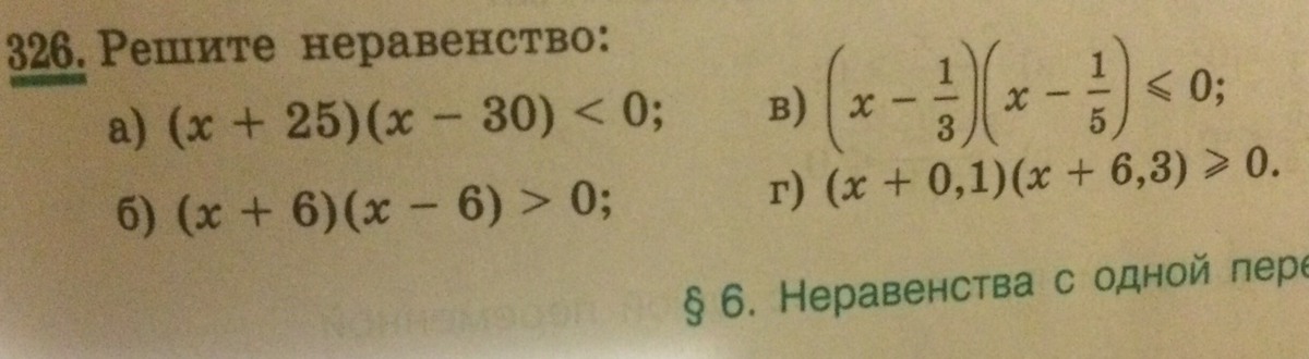 1); ; (x+25)(x-30) textless  0; ,; ; +++(-25)---(30)+++\\xin (-25;30)\\2); ; (x+6)(x-6) textgreater  0; ,; ; ; +++(-6)---(6)+++\\xin (-infty ,-6)cup (6,+infty )\\3); ; (x-frac{1}{3})(x-frac{1}{5}) leq 0; ,; ; +++(frac{1}{5})---(frac{1}{3})+++\\xin [, frac{1}{5},frac{1}{3}, ]\\4); ; (x+0,1)(x+6,3) geq 0; ,; ; ++(-6,3)---(-0,1)+++\\xin (-infty ;-6,3, ]cup [, 0,1, ;+infty )
