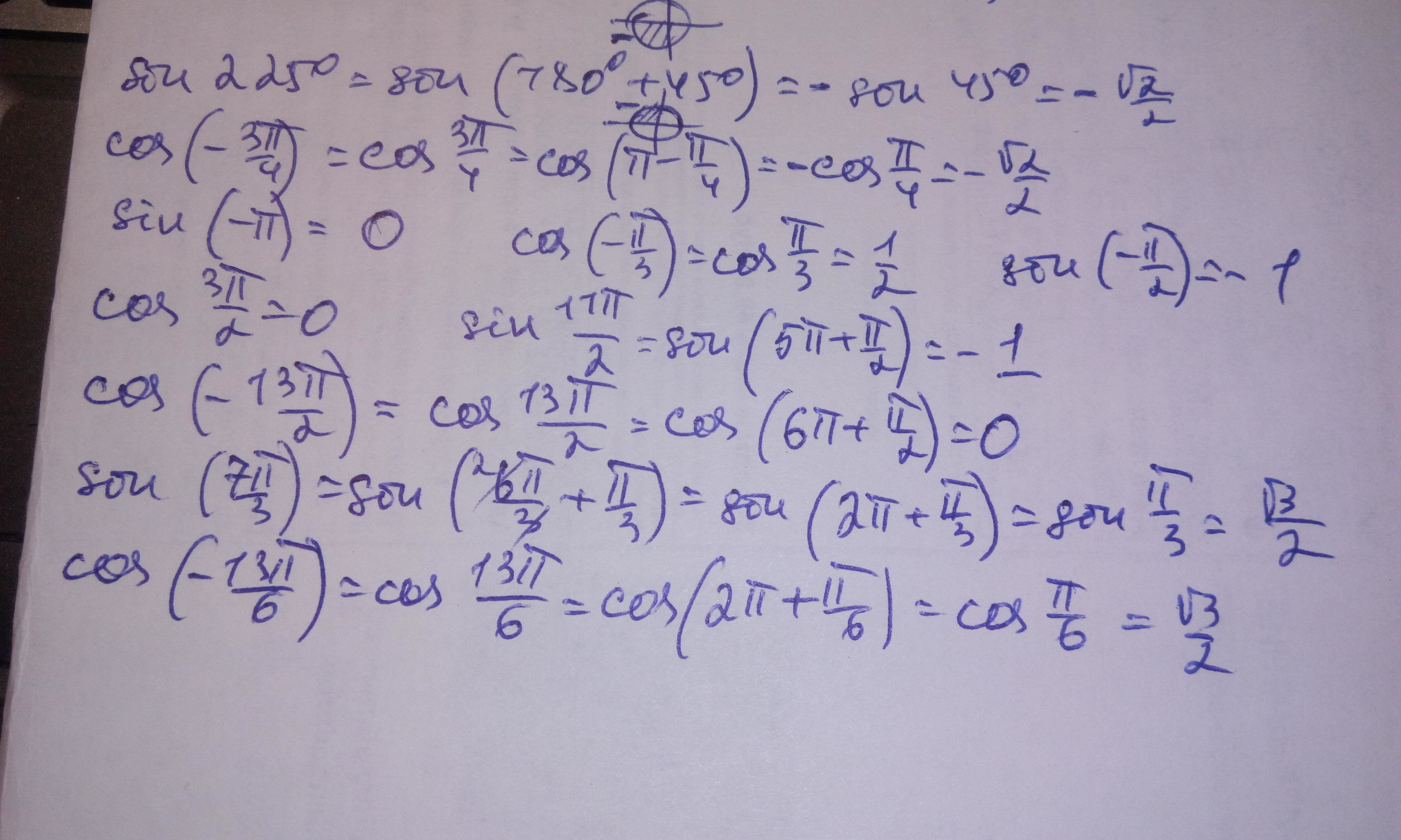 а) sin 225 градусов б) cos (-3П/4) в) sin (-П) г) cos (-П/3) д) sin (-П/2) е) cos 3П/2 ж) sin 11П/2 з) cos (-13П/2) и) sin 7П/3 г) cos (-13П/6)