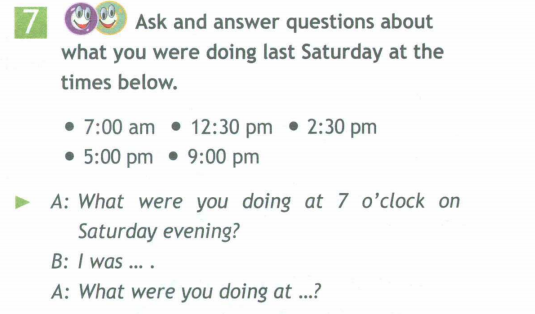 Вопросы 1)What were you doing at 7 o'clock on Saturday morning? 2)What were you doing at 12:30 o'clock on Saturday evening? 3)What were you doing at 2:30 o'clock on Saturday evening? 4)What were you dong at 5 o'clock on Saturday evening? 5)What were you doing at 9 o'clock at Saturday evening? Ответы 1)I was brushing my teeth 2)I was watching TV with my mother 3)I was sleeping 4) I was having a dinner with my family 5)I was playing with my dog