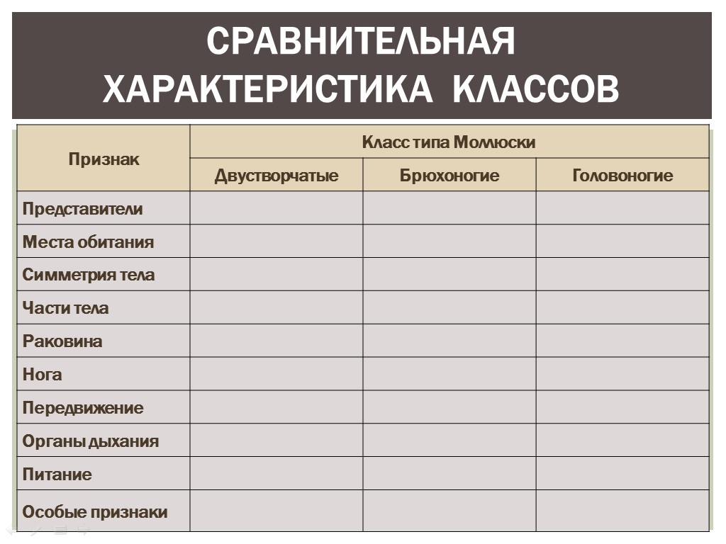 Особые признаки: Вводной, выводной сифоны; Есть печень, почка; Появляются щупальца с присосками, чернильный мешок.