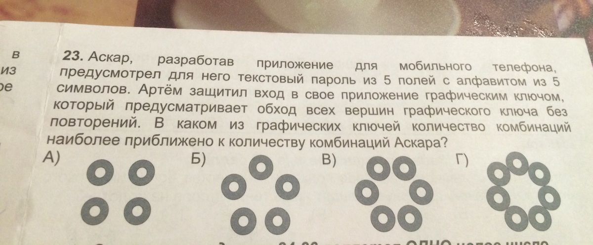 Первый пароль имеет 5^5 комбинаций. Для второго пароля кол-во комбинаций можно вычислить след образом: Вариантов 1 вершины n, далее n - 1...и так до 1. Т.е. для A - 4 * 3 * 2 * 1 = 24; Б - 5 * 4 * 3 * 2 * 1 = 120; В - 6 * 5 * 4 * 3 * 2 * 1 = 720; Г - 7 * 6 * 5 * 4 *3 *2 * 1 = 5040(т.е n!).
