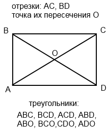 поділити прямокутник аbcd двома відрізками так, щоб вийшло 8 трикутників. Позанач точку перетину відрізків. Запиши трикутники
