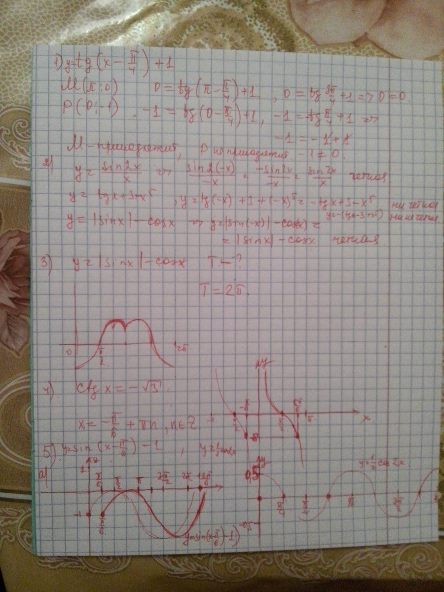 в 5 примере в б я ошибся,извини,график останется тем же,только надписи углов поменяй где п/4 на п/8,где п/2 на п/4,где 3п/2 на 3п/4,и где 2п на п,здесь я перепутал период ведь Т=2п/2=писпавь,если не поймешь спроси,я жду
