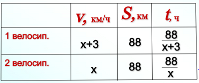 Два атлета Сережа и Коля одновременно со старта отправились в 88 километровый кросс. Сережа бежал со скоростью, на 3км/ч большей, чем скорость Коли, и прибыл к финишу на 3 часа раньше Коли. Какова была скорость бега Коли.