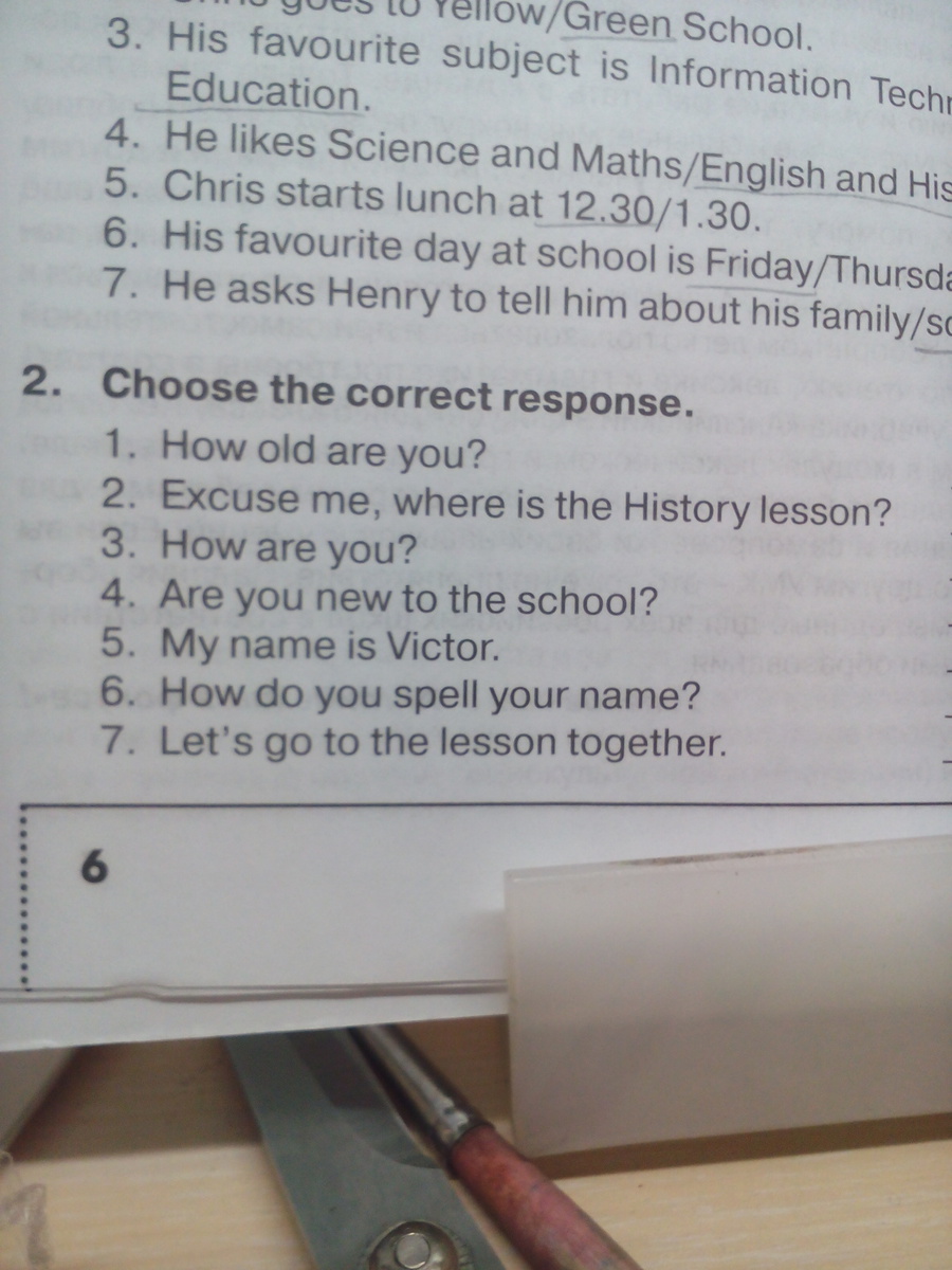 1.Образование,2.Английский и История,3.В двенадцать-тридцать,4.Пятница,5 Не увидела. №3:Сколько тебе лет?;Извините,где находится урок Истории?;Как дела(как настроение?);Ты новенький в школе?; Меня зовут Виктор:Как пишется твоё имя?:Давай пойдём на урок вместе.