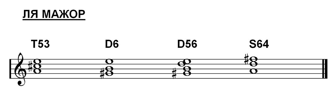 Тоническое трезвучие, доминантовый секстаккорд, доминантовый квинтсекстаккорд и субдоминантовый квартсекстаккорд - на рисунке.