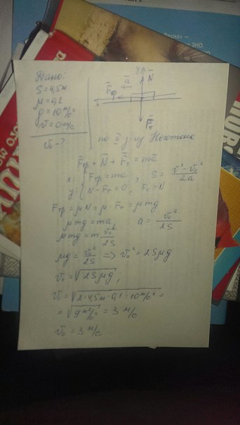 Найти ускорение после наклона. Санки съезжают с горки. После съезда с наклона проходят путь до полной остановки S=4,5 метров. Коэффициент трения равен μ=0,1. Принять g=10 м/с. Скорость после съезда с горки скорость ν=?