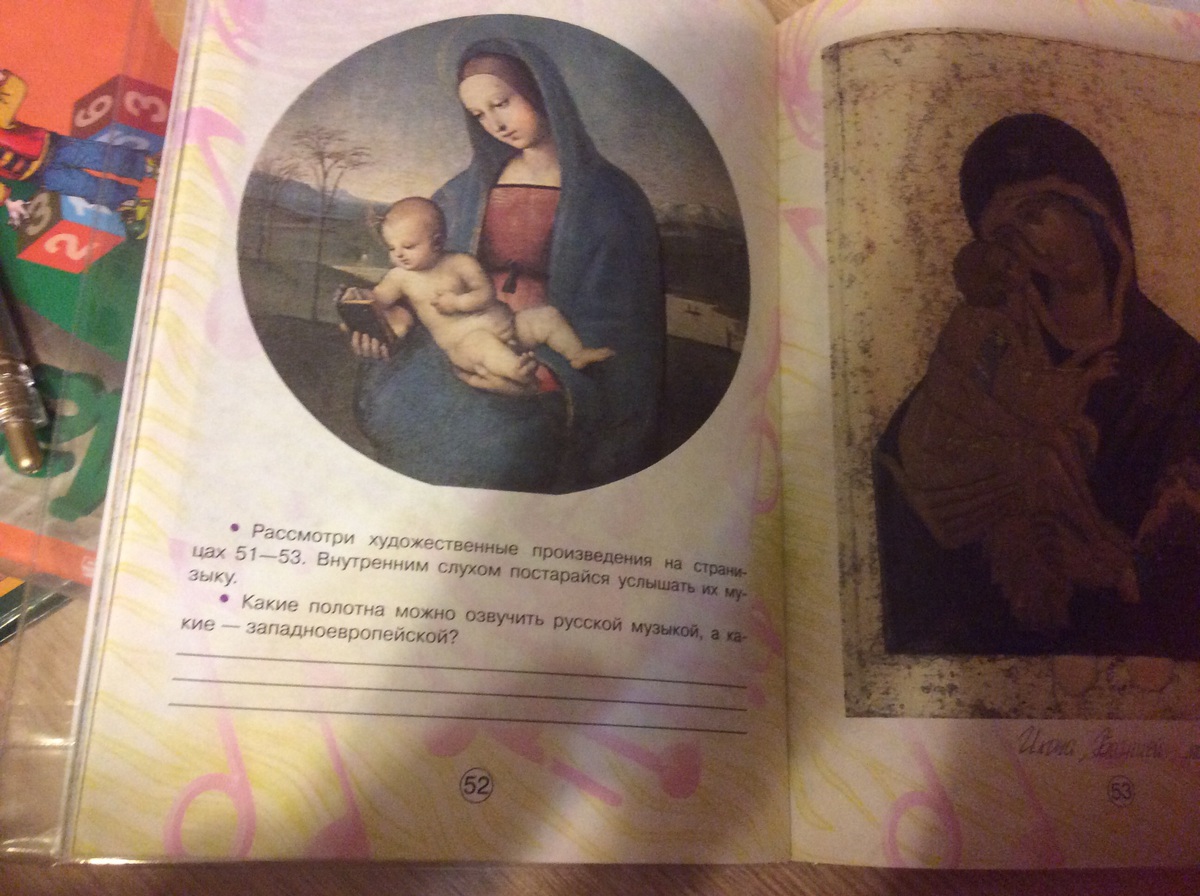 Я бы обе картины озвучила музыкой зарубежных композиторов , которые посвятили Деве Марии свои произведения: это Каччини Ave Maria; Шуберт Ave Maria; Бах-Гуно Ave Maria