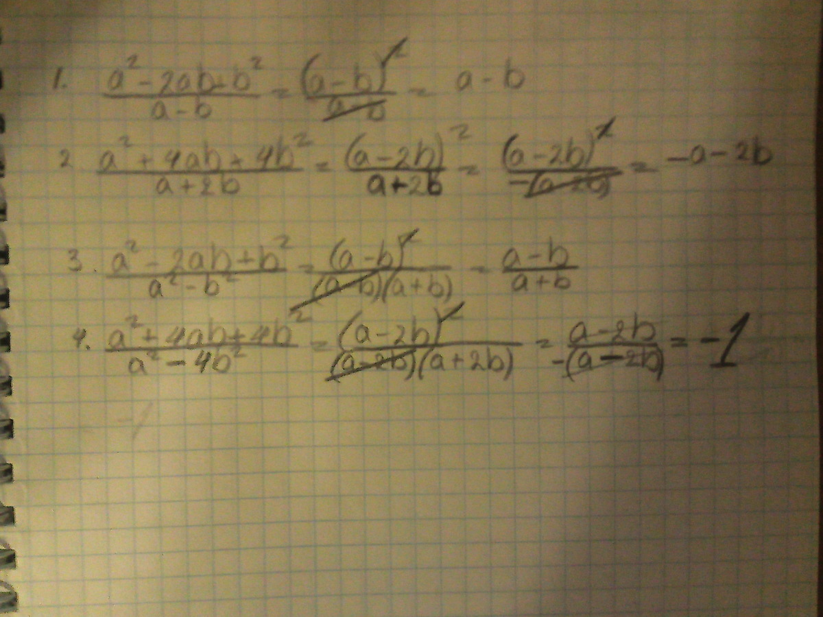 Сократите дробь: a во второй - 2ab+b во второй дробь a-b; Сократите дробь: a во второй +4ab +4b во второй дробь a+2b; Сократите дробь: a во второй - 2ab+b во второй дробь a во второй - b во второй; Сократите дробь: a во второй +4ab+4b во второй дробь а во второй - 4b во второй