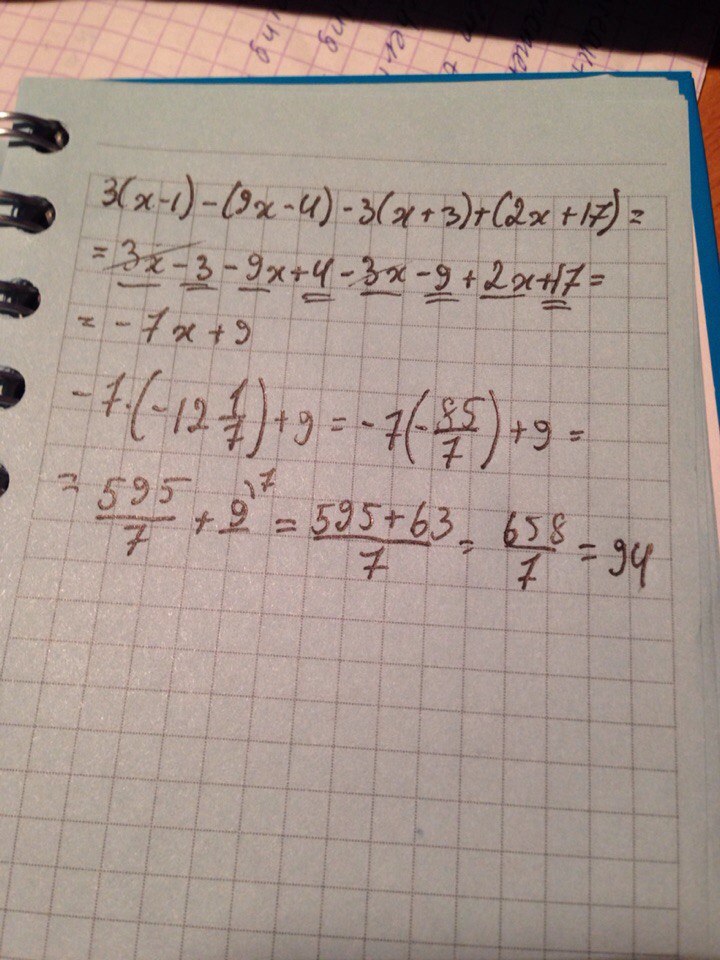 3х-3-9х+4-3х-9+2х+17=-7х+9, если х=-12 17