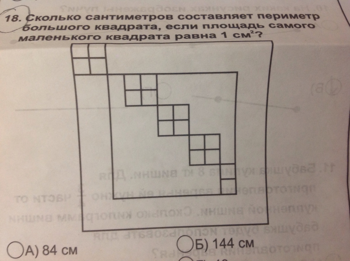 Сколько сантиметров составляет периметр большого квадрата если его площадь самого маленького квадрата равна1см в квадрате