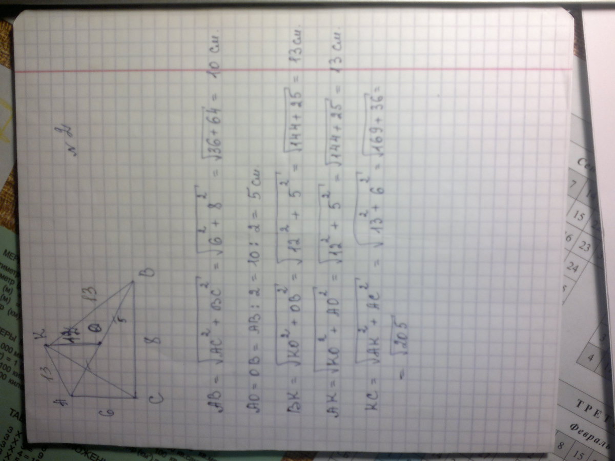 2)Через точку O- середину гипотенузы AB прямоугольного треугольника ABC - проведем в плоскости ABC перпендикуляр OK- не равна 12 см.Катеты треугольника равна 6 см и 8см. Знайты расстояние от точки K до вершин треугольника.
