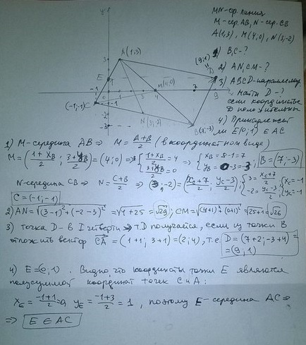 2Найдите длины медиан АN и CM.3Три вершины параллелограмма находятся в точках А ,В и С .Найдите координаты его четвёртой вершины,если известно ,что они положительны 4Принадлежит ли точка Е(0;1) стороне АС