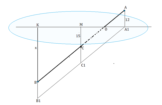 Сложив расстояния от АК+КО получим величину АО-половины отрезка,равное Х=15+12=27⇒