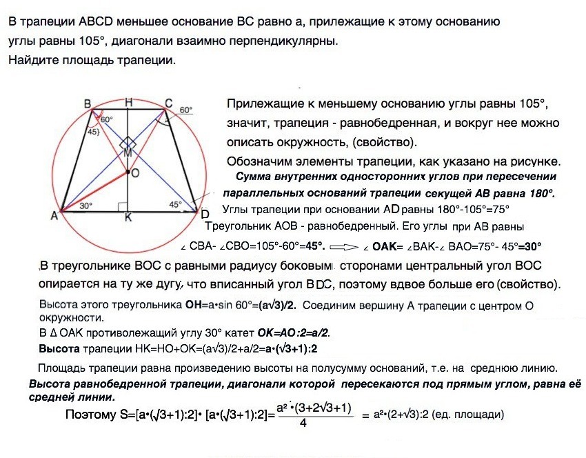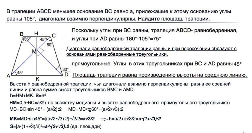 Помогите решить задачу. В трапеции ABCD меньшее основание BC равно a, прилежащие к этому основанию углы равны 105°, диагонали взаимно перпендикулярны. Найдите площадь трапеции.