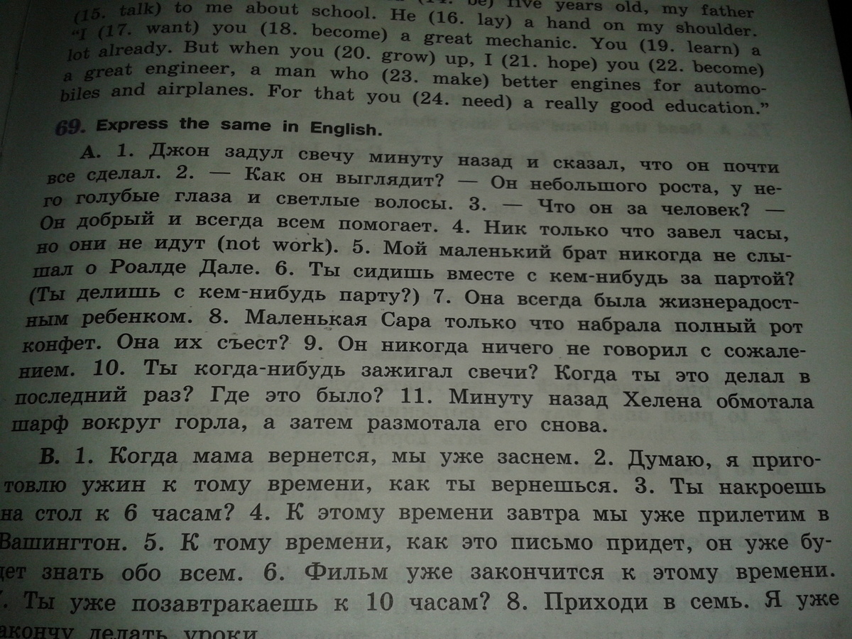 1 John blew out a candle minute back and said, that he did almost everything. 2 - As does he look? it is He small height, for him blue eyes and tow-head . 3 - That he for persons? - He is kind and helps always all . 4 Nik just winded up clocks, but they do not go. 5 My little brother not when did not hear of Roald Dale. 6 do you sit together with anybody after a school desk? ( Are you partaken with anybody by a school desk?) 7 She always was a cheerful child. 8 Little Sara collected the complete mouth of candies just. Does she them eat? 9 He when talked nothing regretfully. 10 did you some time set fire candles? Where was it? 11 Minute back Helen wrapped around a scarf round a throat, and then winded off it again