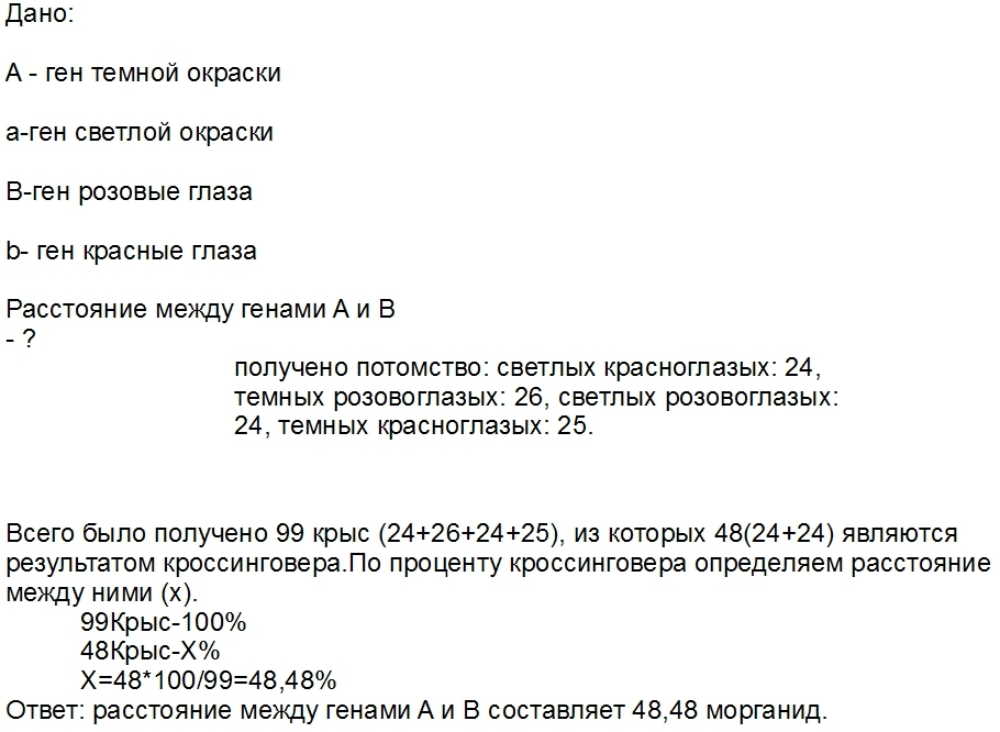У крыс тёмная окраска шерсти доминирует над светлой, розовый цвет глаз над красным. Оба признака сцеплены. В лаборатории от скрещивания розовоглазых тёмношерстных крыс с красноглазыми светлошерстными получено потомство: светлых красноглазых: 24, темных розовоглазых: 26, светлых розовоглазых: 24, темных красноглазых: 25. Определите расстояние между генами.