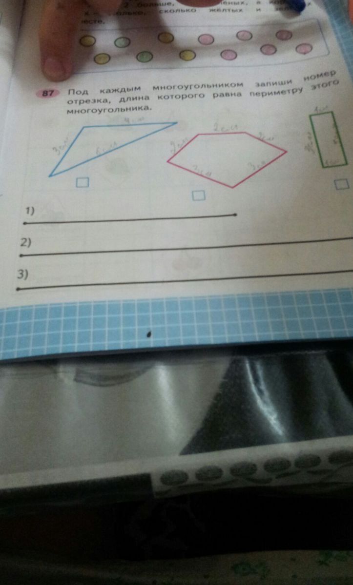 теперь измерь отрезки линейкой под цифрами 1), 2), 3) потому что я не смогу по фото и сравни длину отрезков с периметрами фигур какой отрезок из них будет 13 см, 12 см, 8см и расставь цифры