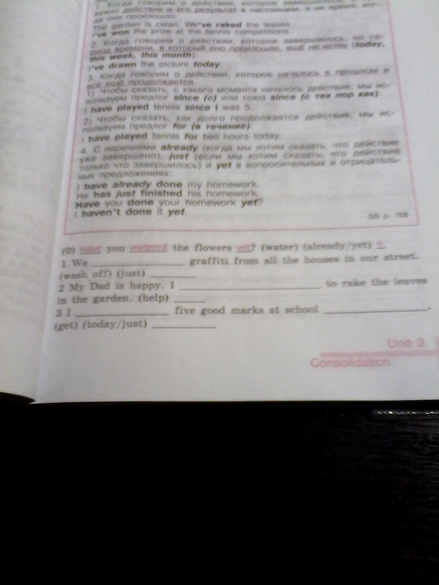 1. we have just washed off graffiti...; 2. I have helped...; 3. I have just got