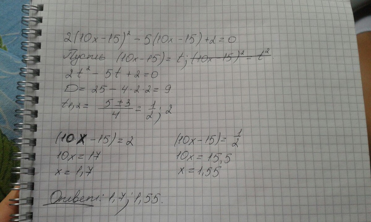 Реши квадратное уравнение 2(10x−15)^2−5(10x−15)+2=0