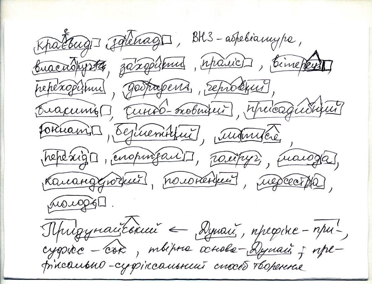 1.Розібрати слова за будовою: краєвид, зорепад, ВНЗ, власноруч, заходити, праліс, вітерець, переходити, добридень, черговий, блакить, синьо-жовтий, присадибний, юннат, безмежний, митися,перехід, спортзал, голіруч, молода, командуючий, полонений, медсестра, молодь. 2.Виконайте словотвірний аналіз слова - придунайський.