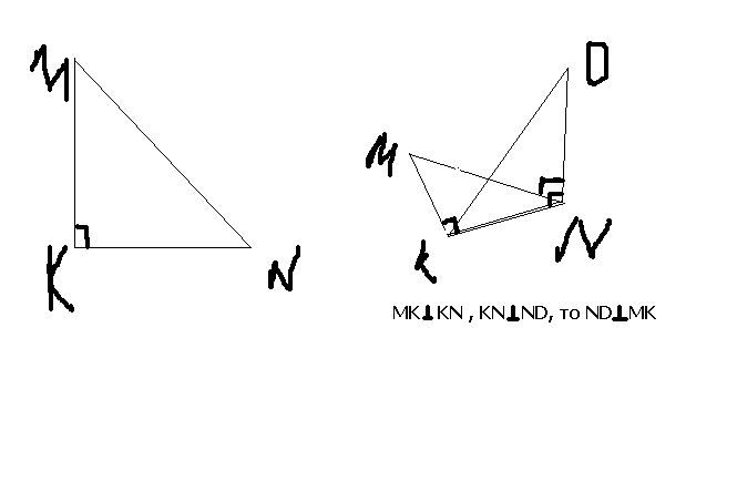 1) В треуголнике MNK сумма углов M и N равна 90 градусов. Прямая ND перпендикулярна плоскости MNK. Доказать, что KD перпендикулярна MK.