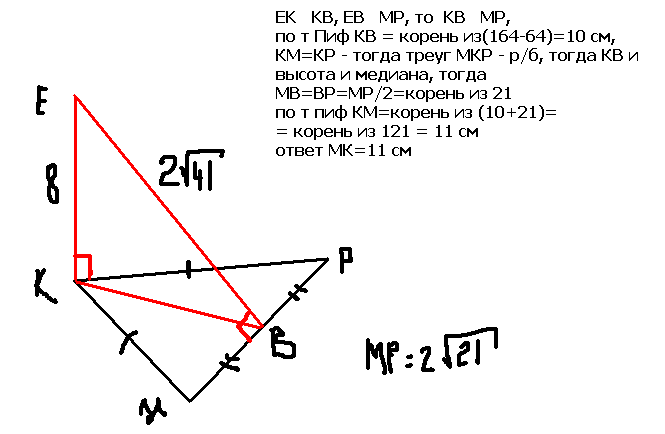 2) Через вершину K треугольника KMP проведена прямая KE, перпендикулярная плоскость этого треуголника. Расстояние от точки E до прямой MP равно 2 корня из 41 см. Найдите KM, если KE =8 cм, MP = 2 корня из 21 см, MK=KP.