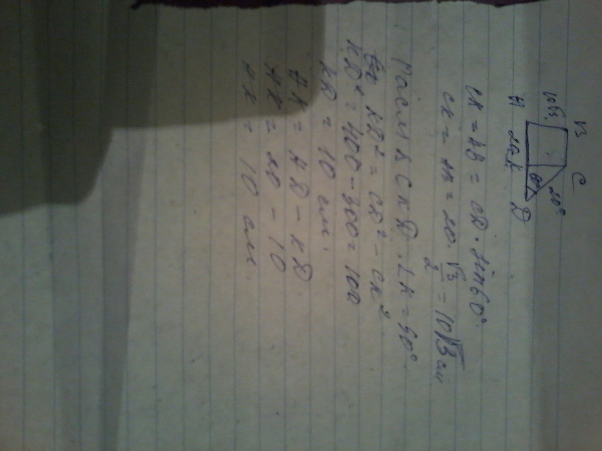 Задача: В прямоугольной трапеции острый угол равен 60 градусов. Большая боковая сторона и большее основание равны 20 см. Найти меньшие основание.