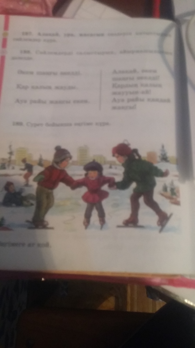 Қыс мезгілі.Бугін күн жексенбі.Айдос пен Марат қарындастары Ажарды сырғанатып ойнатты.Ажар көңіллі,балаларла мəз болды.