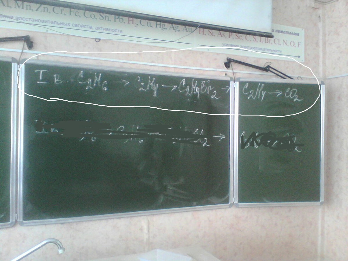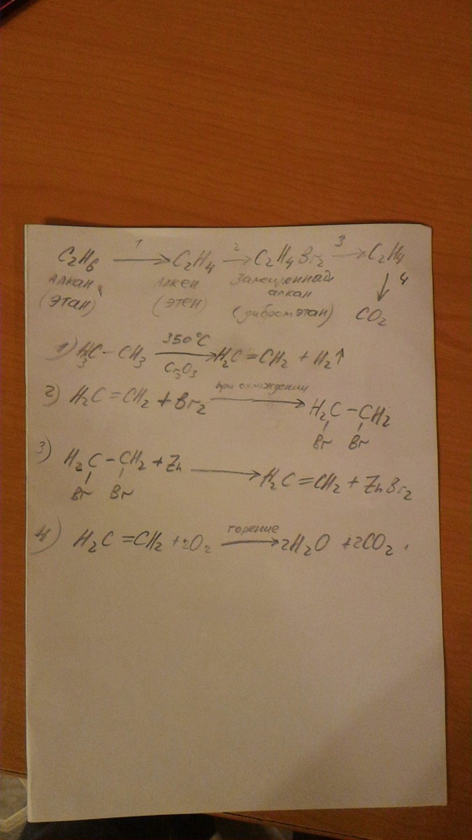 [В скобах условие реакции] C2H6[Cr2O3, t=350,-H2]=C2H4+H2↑ ; C2H4+Br2 [CCl4, t=0]=C2H4Br2 ; C2H4Br2+Zn [t]=C2H4+ZnBr2 ; C2H4+3O2[t]=2CO2+2H2O.