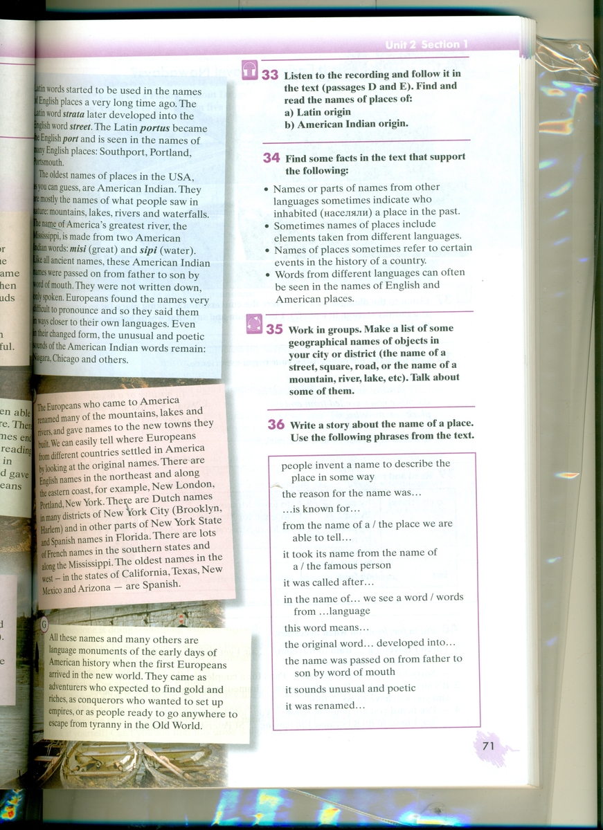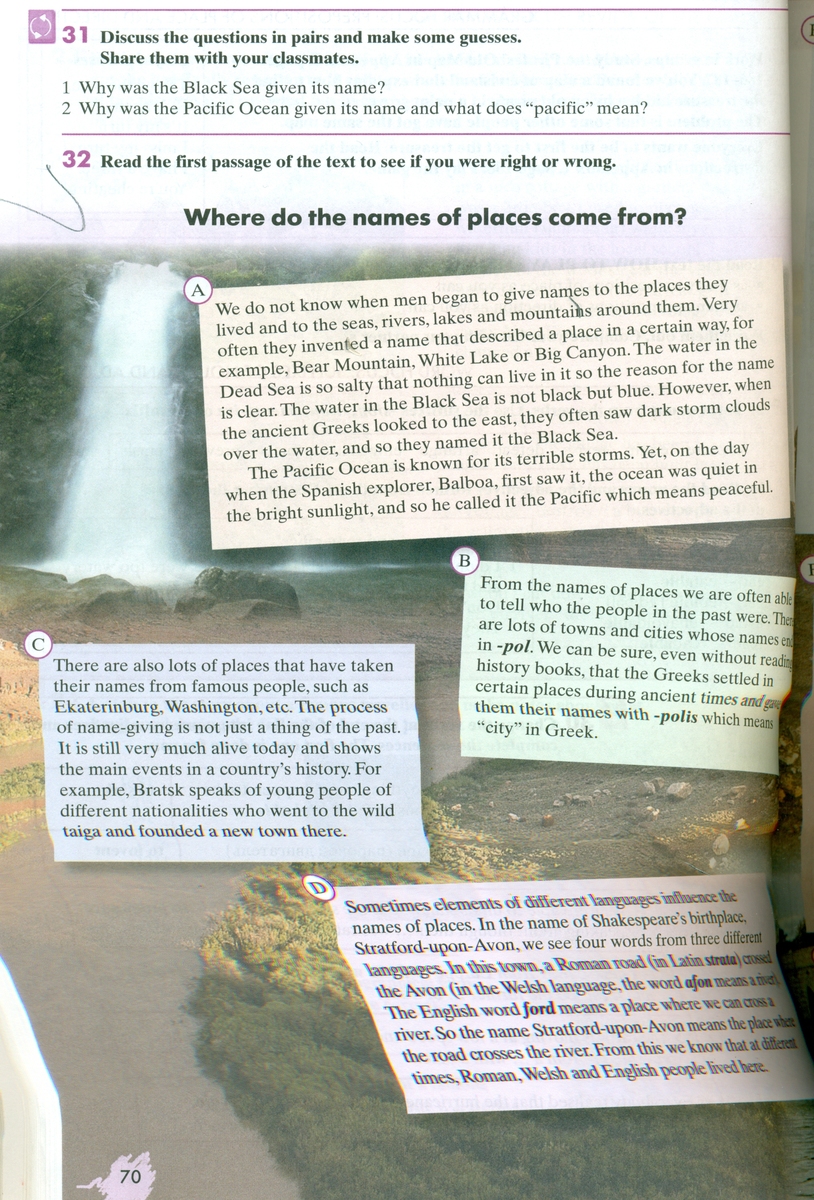 D: Иногда элементы из разных языков оказывают влияние на названия. Например, в названии города Стратфорд-на-Эйвоне, места, где родился Шекспир, можно различить слова четырёх разных языков. В этом городе романская (римская) (s... [не вижу слово] по-латыни) дорога пересекает Эйвон (afon? на валлийском обозначает реку), а английское форд означает переправу через реку. Таким образом, Стратфорд-на-Эйвоне переводится как место, где дорога пересекает реку. Нетрудно понять, что в разное время там жили и римляне, и валлийцы, и англичане.