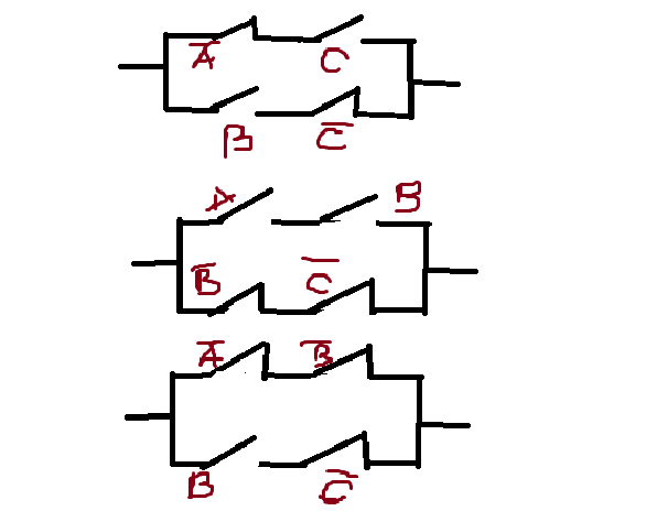 Вот, если я не путаю, что требуется) последовательные переменные мы перемножаем, параллельные - складываем. НЕ(верхнее подчеркивание) обозначается как закрытая "дверка"