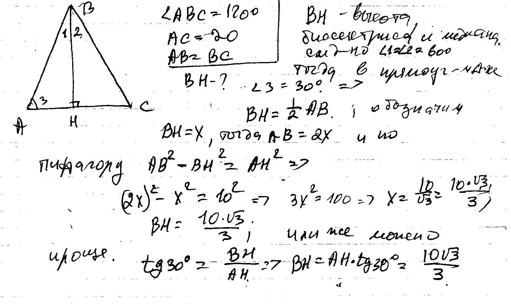 В равнобедренном треугольнике основание равно 20, а угол между боковыми сторонами равен 120 градусам;. Найдите высоту, проведённую к основанию