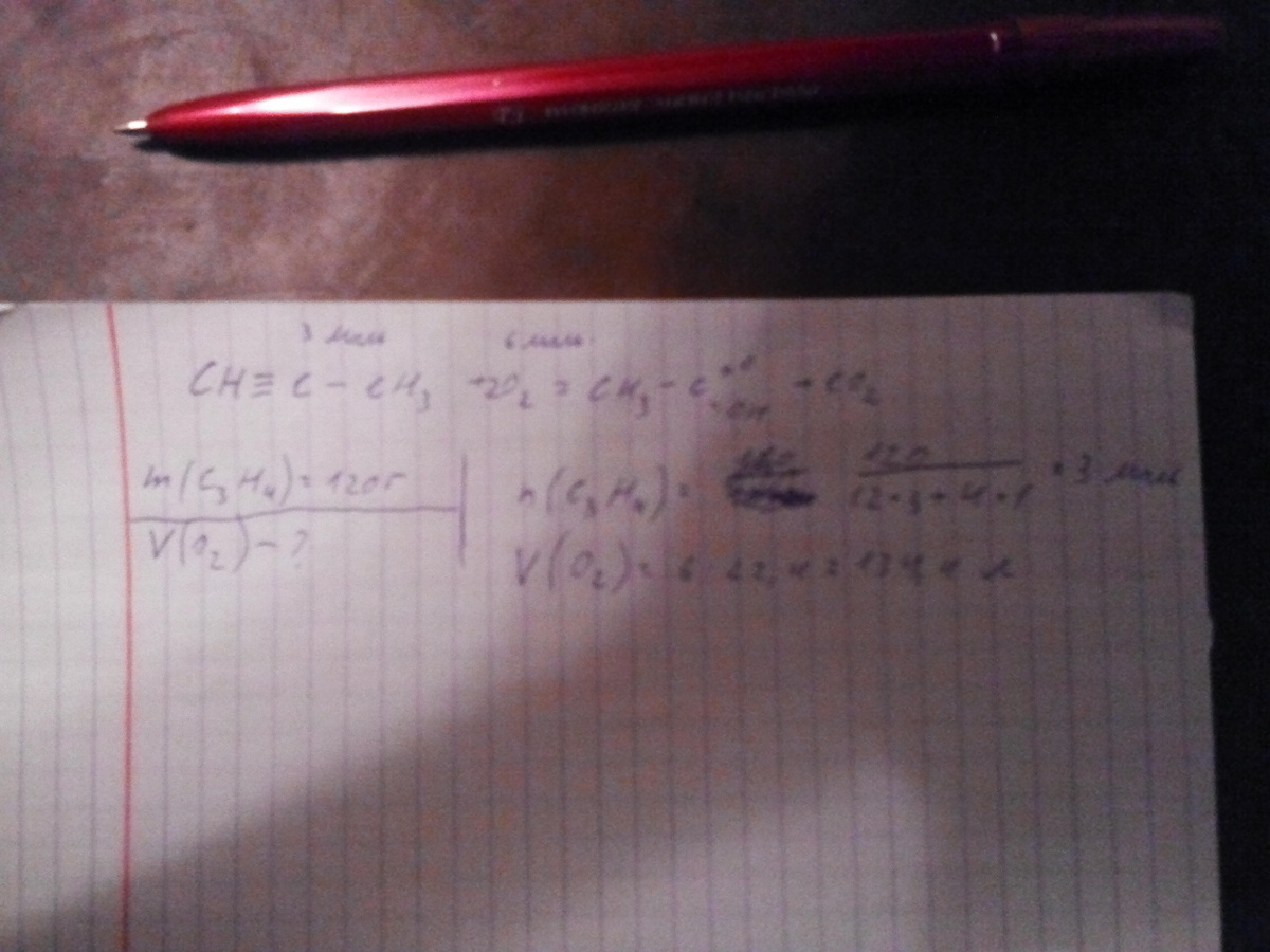 Находишь n(C3H4)=m(C3H4)/Mr(C3H4)=120/12*3+4*1=3моль. Т.к n(C3H4)=2n(O2) то n(O2)=6моль. Находим V(O2)=6*22,4=134.4л.