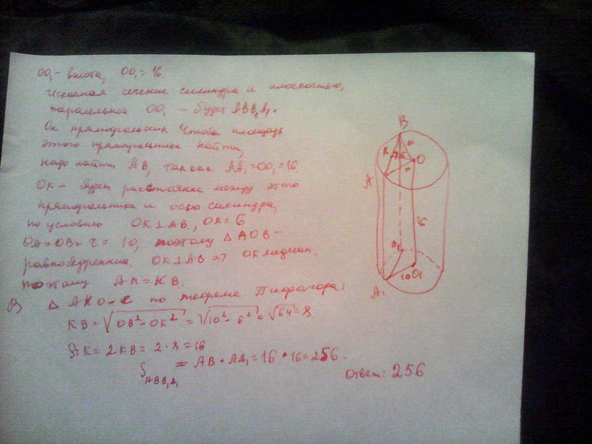 высота цилиндра равна 16, радиус 10. Вычислите площадь сечения цилиндра плоскостью, параллельной оси цилиндра, если расстояние между этой плоскостью и осью цилиндра равно 6.