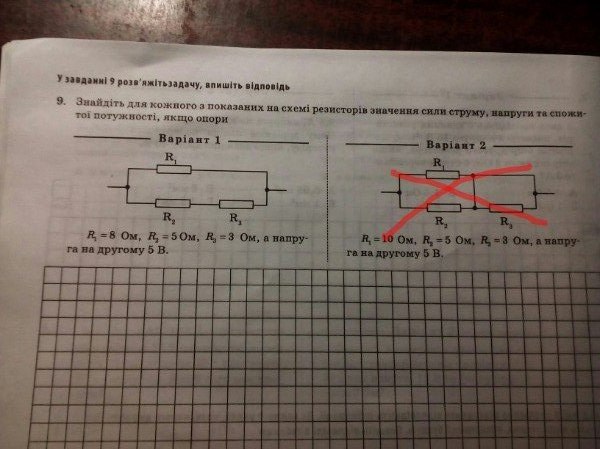 найдите для каждого из показанных на схеме резисторов значения силы тока, напряжения и потребляемой мощности, если сопротивления R1 = 8 Ом, R2= 5 Ом, R3= 3 Ом, а напряжение на втором 5В