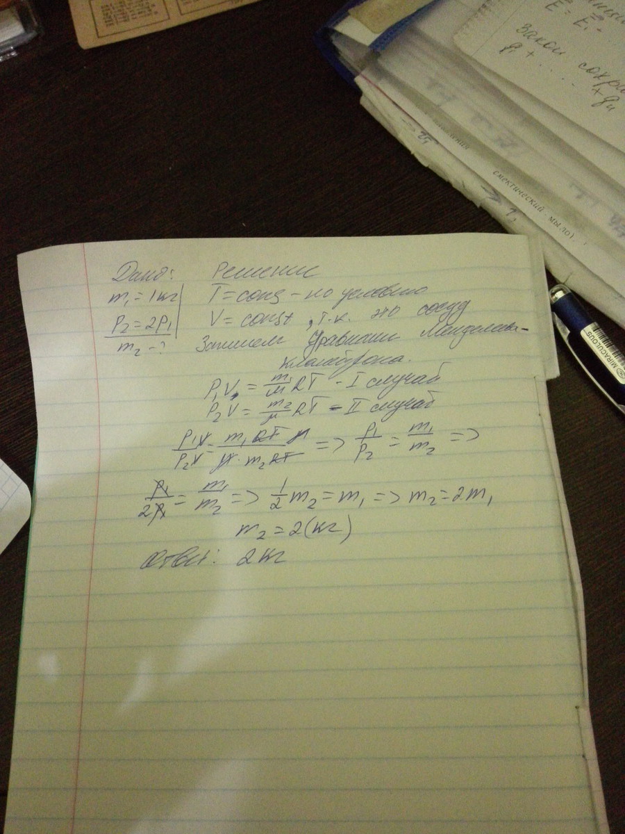 в сосуде находится 1 кг некоторого газа. при добавлении в сосуд массы этого газа давление в сосуде увеличилось вдвое. определить какое количество газа было добавлено в сосуд. температуру газа считать постоянной